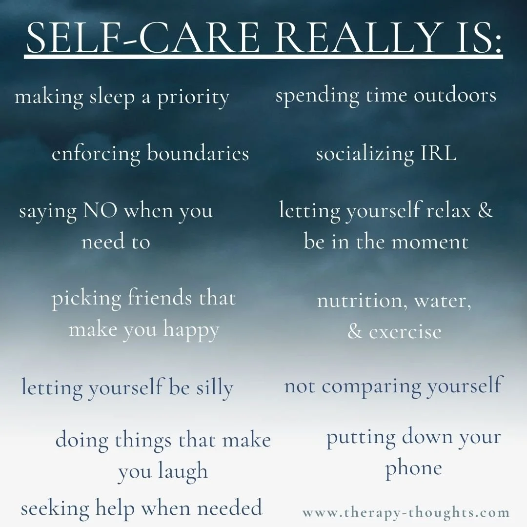The first (and most important piece) is often dismissed, misunderstood, or even ridiculed. Self Care. Self care is not just spa days or hot baths. Self care is about placing the importance of your body’s needs higher on your to-do list and that can be INCREDIBLY difficult for many people. These needs include sleep, nutrition, positive socialization, health, and new or emotionally rewarding experiences. They are the pieces that allow you to build a good mental/physical/emotional foundation for yourself. Self care is more important than merely seeking happiness in a moment, it’s about seeking balance and stability within yourself.