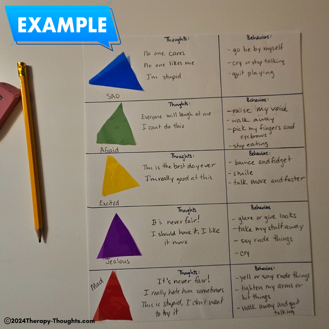 How we feel can change what we think about and what we want to do while we are feeling that way. That is the thoughts and behaviors sections. Pick a feeling for each column and have them write down ways it changes what they think about and how they act. This can include things we start to do (yell) or things we stop doing (talking).